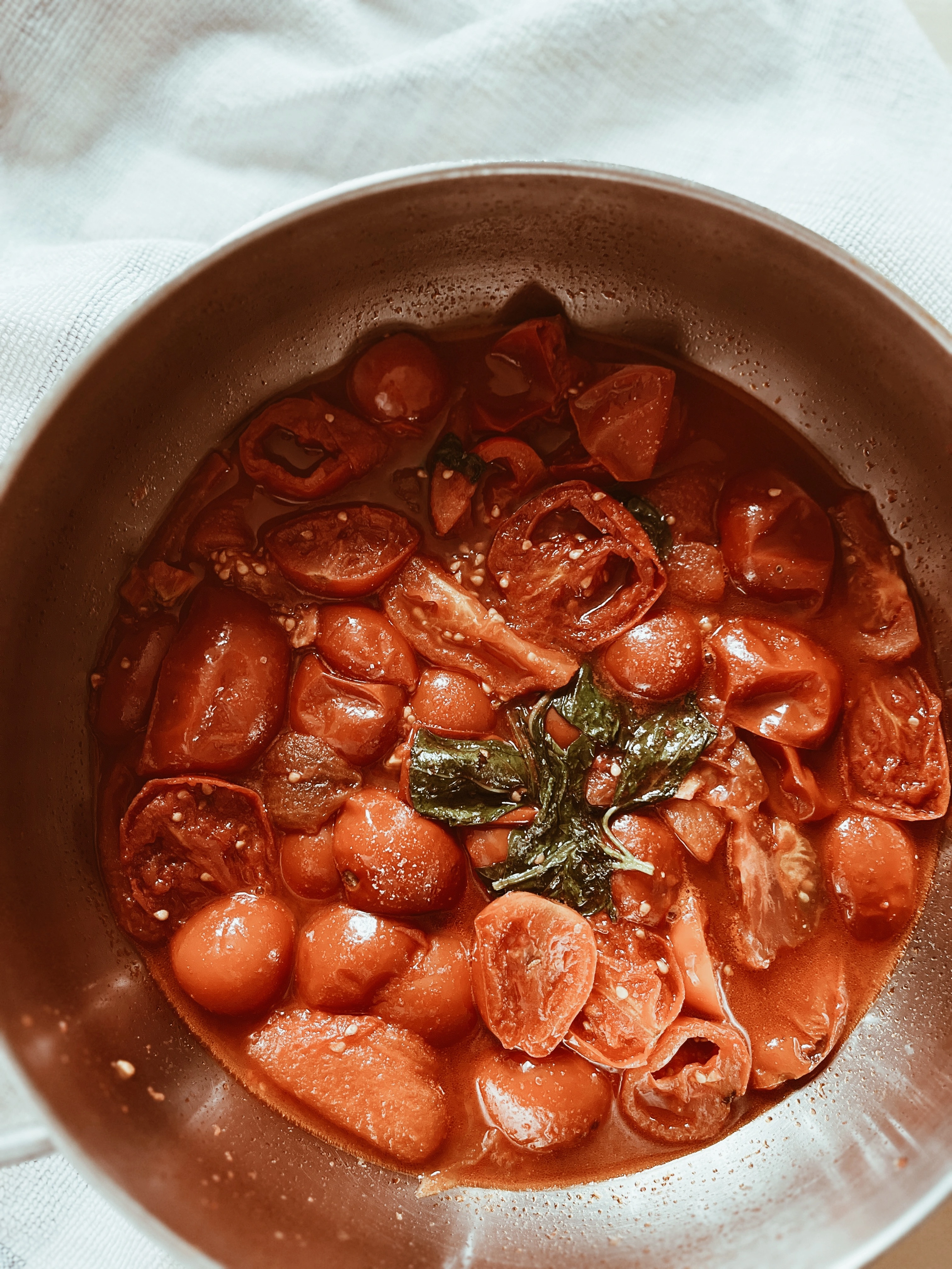 • Return the sauce to the pan and add fresh basil leaves to garnish.